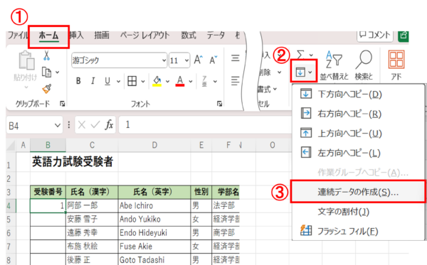 入力したセルを選択した状態で「ホーム」タブ→「フィル」ボタン(四角いマーク)→「連続データの作成」をクリックします。