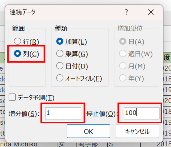 「範囲」を列に設定し、データ予測欄の増分値に「1」、停止値に「100」と入力します。
