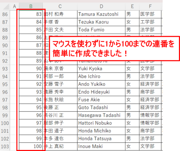 これを使えば、1から100までの番号を自動で素早く入力することができます。