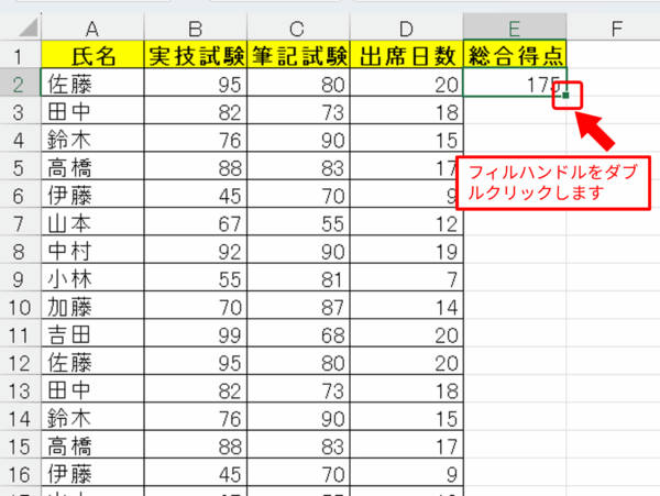 セルの右下(フィルハンドル)をダブルクリックすると、 上のパターンに合わせて一気に下までコピーできます。