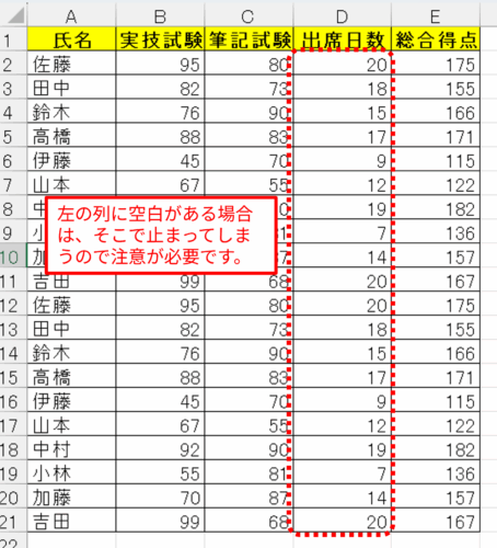 左の列に空白がある場合は、そこで止まってしまうので注意が必要です。
