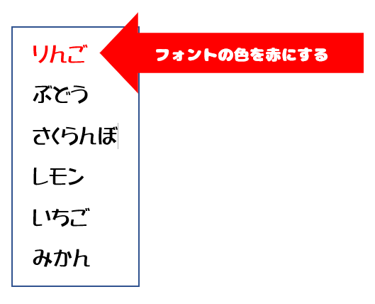 ①1行目の「りんご」の文字の色を【赤】に設定します。