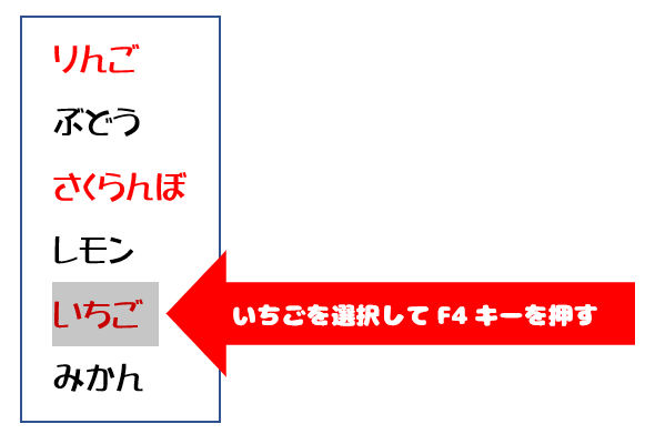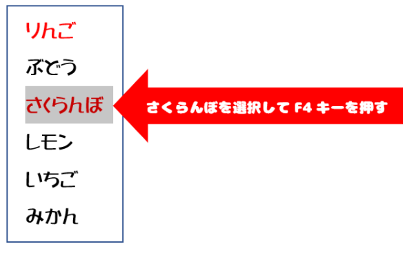 ②3行目「さくらんぼ」の文字列を選択し、キーボードからファンクションキー【F4】を押します。