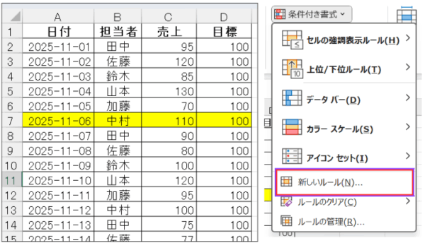 これで、売上が目標を下回ったセルだけ赤くなります。