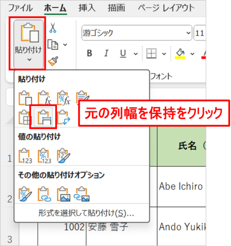 ホームタブ→クリップボード→貼付け→元の列幅を保持をクリック