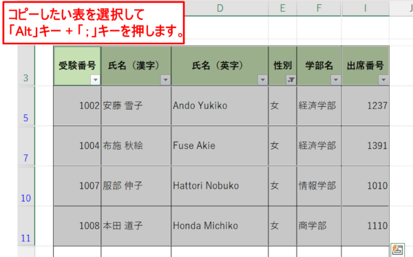 これで、見えている(可視)セルだけが選択されます。ショートカットは「Alt + ;」です。
