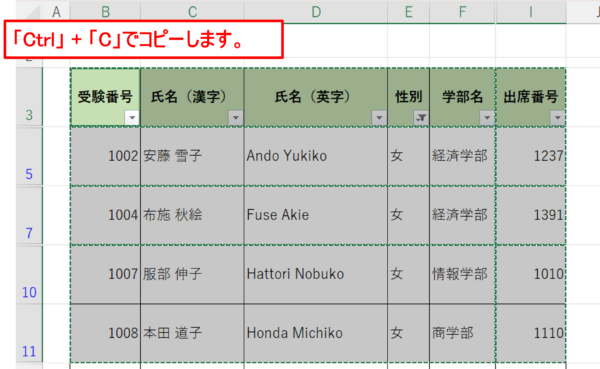 Ctrl + Cを押して選択した可視セルをコピーします。
