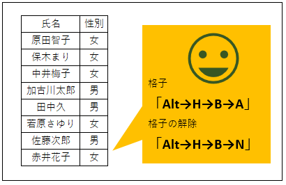 ①「格子」とは、表計算でセルのすべてに線を付けた状態のこと。