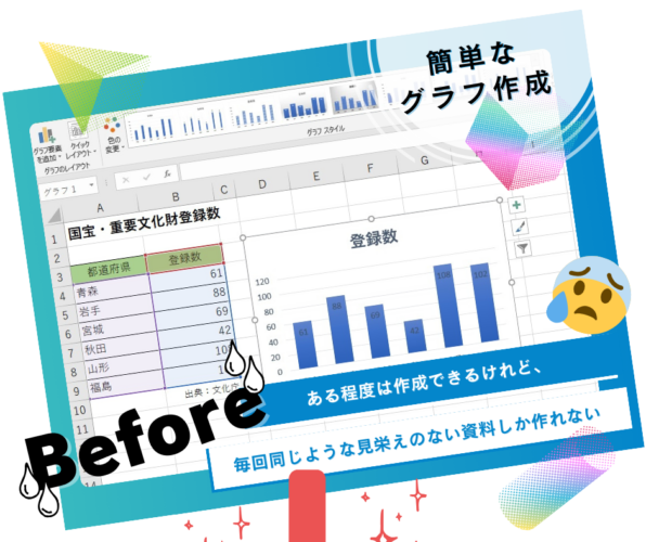 「グラフを扱えます!」という自己流の方でも、いつも使うグラフが同じものだったり、項目を範囲選択し、極シンプルな縦棒グラフや円グラフなどで完成…毎回同じようなグラフを使用して見栄えのない資料を作成している…という方も多くいらっしゃると思います。