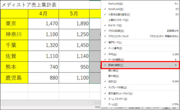 試しに「数値の個数」をオートカルクに加えてみましょう。